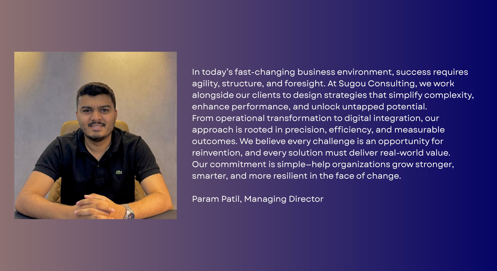 With decades of expertise in guiding organizations toward purposeful growth, Sugou Consulting Pvt Ltd continues to advance—integrating strategic insight, multidisciplinary talent, and intelligent frameworks to navigate an increasingly complex business landscape.